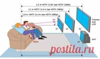 Многие ТВ-поклонники мечтают о большой плазме вполовину стены. Купить такой телевизор несложно, но прежде чем это сделать, проверьте, насколько параметры вашей комнаты позволят смотреть на такой монитор без вреда для здоровья. Расстояние, комфортное для глаз от монитора — 3-4 диагонали экрана, в случае с жидкокристаллическими мониторами — 2-3 диагонали. То есть, 40-дюймовый телевизор нужно смотреть с расстояния 80-120 или 120-160 дюймов (1...