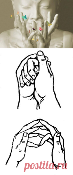 Методика исполнения: мизинец левой руки прикасается к сердечному (безымянному) пальцу правой руки; мизинец правой руки касается сердечного пальца левой руки. Одновременно соединяется средний палец правой руки с указательным пальцем левой руки, а средний палец левой руки с указательным пальцем правой руки. Большие пальцы расставлены.