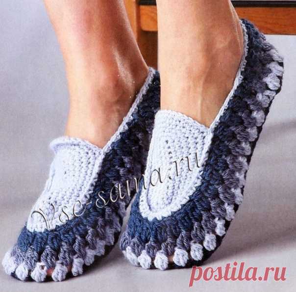 Вам потребуется: остатки толстой пряжи одинаковой толщины синего, серого и голубого цветов, крючок №4, стельки.