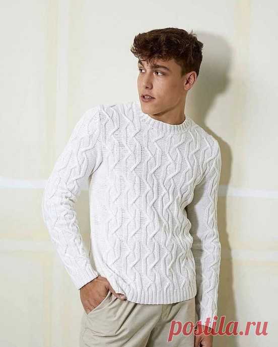 Мужской пуловер Мужской пуловер с рельефным узором связан спицами. Пуловер связан из пряжи белого цвета (100% шерсть мериноса). Пуловер связан спицами №3,5-5 и №4-5. Основной рапорт узора составляет 32 петли. Узор пуловера симметричный относительно центральной косы.