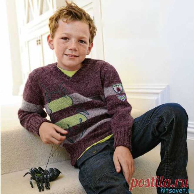 Для мальчика 4-10 лет. Пуловер в полоску с капюшоном. Вязание спицами для мальчиков со схемами и описанием