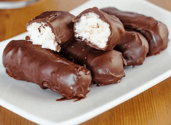 🔹Полезные Баунти 🔹 🔸Итого на 100 грамм - 166.8 ккал:🔸 Белки- 8.75 🔸Жиры - 9.8 🔸Углеводы - 20.3🔸 Ингредиенты: Кокосовая стружка - 20 г Сухое обезжиренное молоко - 30 г Молоко - 2-3 ст. л. Мёд - 1-2 ч.л. Горький шоколад - 1 плитка Приготовление: 1.Смешиваем все ингредиенты, кроме шоколада. 2. Лепим колбаски и в морозилку минут на 10, затем топим горький шоколад, поливаем сверху и снова в морозилку еще минут на 5. Приятного аппетита!🍴