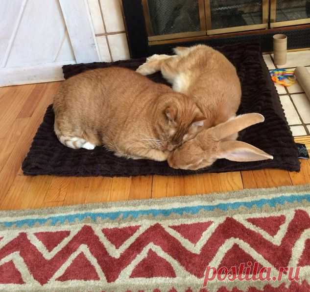 Удивительная дружба между кроликом и котом!