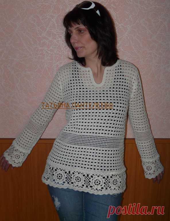 Ажурный пуловер с вырезом каре крючком | Рукоделие и вязание