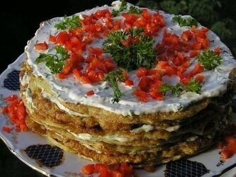 САЛАТ С КУРИНОЙ ПЕЧЕНЬЮ Ингредиенты 1. Куриная печень - 500 г (тертая) 2. Лук - 2 шт. (обжаренный) 3. Морковь - 1 крупная (обжаренная) 4. Огурцы маринованные - 4 шт. (нарезанные) 5. Яйца - 4 шт. (тертые) 6. Сыр - 100 г (тертый) 7. Майонез - по вкусу (для слоев)