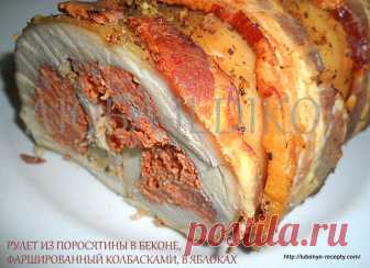 Рулет в яблоках из поросятины, в беконе, фаршированный колбасками