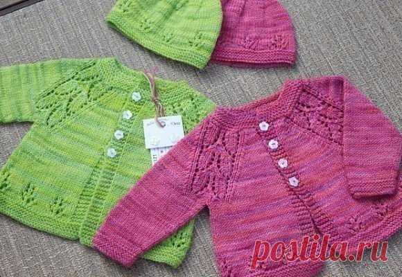 Кофточка-жакетик для самых маленьких связана спицами, украшена ажурными рисунками по низу изделия, напоминающими цветочки, а по регланным линиям — узор из листиков. Модель подходит как девочкам, так и мальчикам, в зависимости от выбранного цвета пряжи и пуговок.