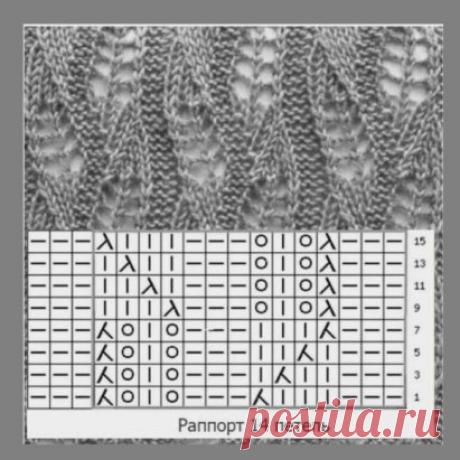 Рапорт узора 8 петель, количество петель увеличивается в течении вязания рапорта, но после того как будет связан один рапорт, количество петель уровняется с первоначальным количеством петель. В высоту рапорт узора 12 рядов.
