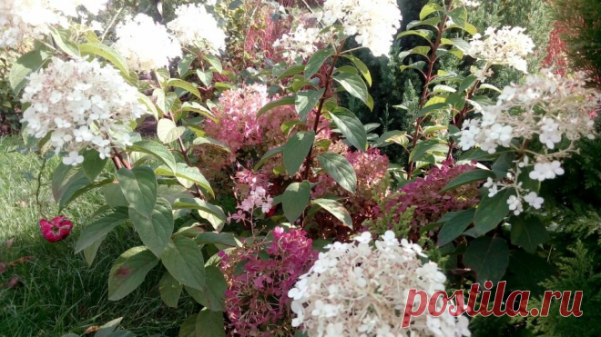 Пышные шапки цветов гортензии окрашены в белый, роз...