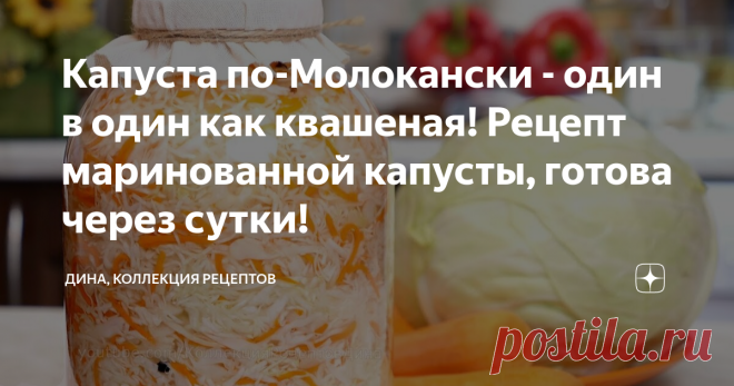 Капуста по-Молокански - один в один как квашеная! Рецепт маринованной капусты, готова через сутки! Друзья мои, всем привет! С вами Дина и канал «Коллекция Рецептов». Как хорошо, когда в доме есть запасы различных вкусных солений! В прошлый раз я делилась с вами рецептом приготовления квашеной капусты в рассоле и все, кто ее готовил остались очень довольны! Такая капуста бывает готова через 3 дня, а сегодня предлагаю вам рецепт быстрой маринованной капусты по-Молокански, ко...