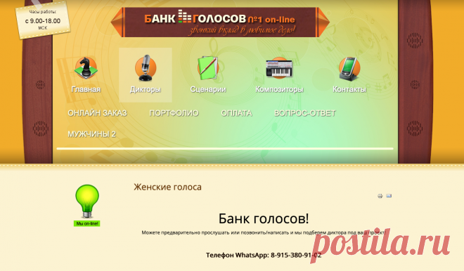 Подобрать голос диктора или чтеца просто и в то же время... такой тонкий процесс. Опытный менеджер по продаже голосов поможет подобрать диктора под вашу задачу и ваш бюджет. Обращайтесь к профессионалу и он подберет вам профессионала! Закон рынка! Диктор в аудиоролике или голос за кадром презентации вашей компании - часть вашей компании, он ее голос! Пусть он будет привлекательным, располагающим, презентабельным и харизматичным! Банкголосов Онлайн - 12 лет на страже вашей голосовой репутации!