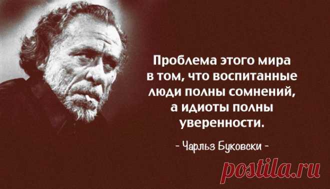 1. Хорошо, когда есть куда пойти, когда всё плохо. 2. Я обычно плох, но, когда я хорош, я хорош дьявольски. 3. Просто жить, пока не умрешь, — уже тяжелая работа. 4. Видеть на экране всякое дерьмо стало столь привычным, что люди перестали отдавать себе отчет в том, что смотрят одно дерьмо. 5. Писатели — это отчаянные люди, и, когда у них появляется надежда, они перестают быть писателями. 6. В 25 гением может быть любой. В 50 для этого уже что-то надо сделать. 7. Дела шли хорошо, но неизвестно…
