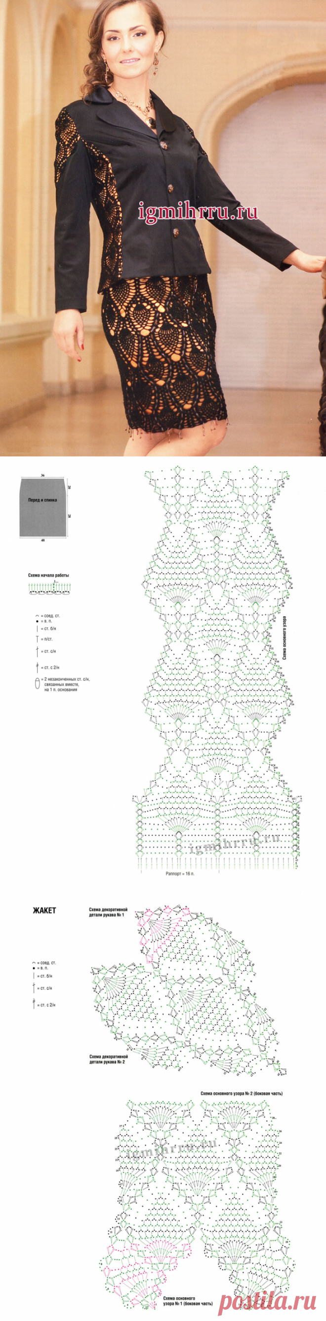 Эффектный костюм черного цвета: юбка и жакет с узорами из «ананасов». . Вязание крючком + ткань