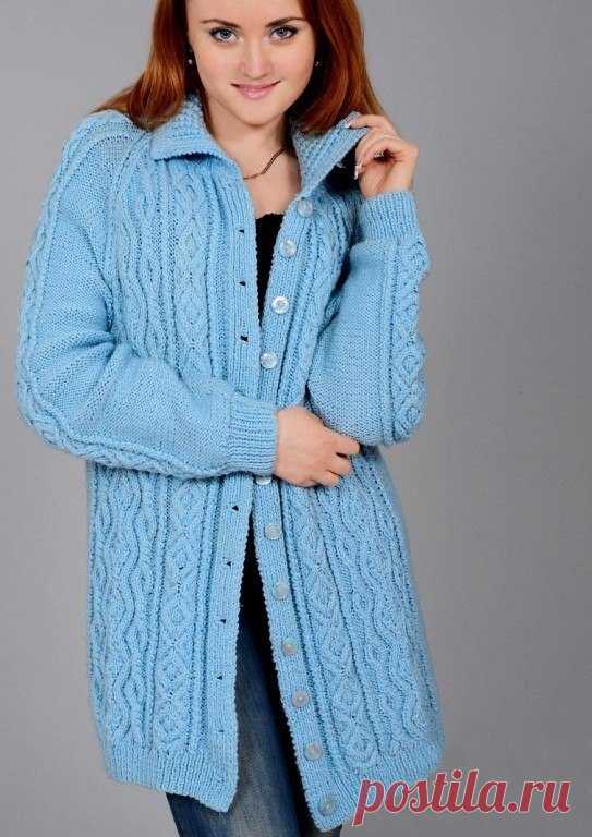 Пряжа (90% натуральной шерсти, 10% кашемира; 160 м/50 г) — 550 (650) г голубой; спицы №4; круговые спицы №3,5 и 4; 5 пуговиц.