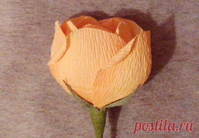 Роза из гофрированной бумаги Для создания такой розы нам необходимы материалы: — гофрированная бумага зеленого цвета; — гофрированная бумага оранжевого цвета; — бамбуковая палочка; — клеевой пистолет; — ножницы; — линейка; — нить...