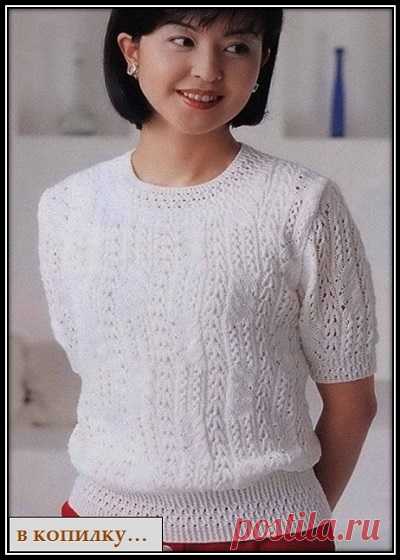 Вам потребуется: 500 (550) г белой пряжи Goby (65% хлопка, 35% вискозы, 85 м/50 г); прямые и круговые спицы № 4.