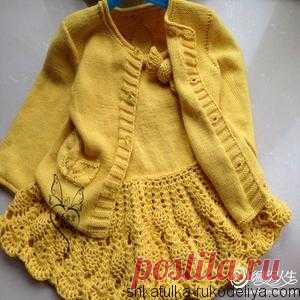 Желтый комплект для девочки Желтый комплект для девочки спицами и крючком. Ажурный сарафанчик дополнен теплой кофтой. Юбка сарафана вяжется красивым узором ананас. Кофточку украшают объемные листья.…
