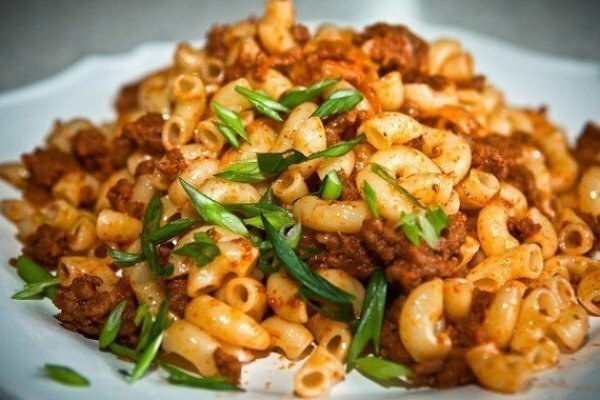 Макароны с мясом и тушеной капустой