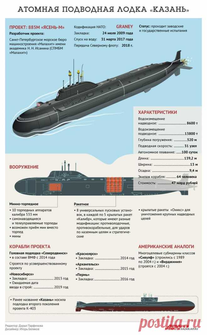 Атомная подводная лодка «Казань» ИнфографикаСеверный флот РФ в скором пополнится новой субмариной - атомным подводным крейсером «Казань», построенным по усовершенствованному проекту «Ясень-М». Подлодка обладает принципиально новыми а...