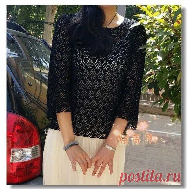 Красивейшая ажурная кофточка крючком. Мне кажется, она смотрится одинаково красиво как в черном, так и в белом цвете.