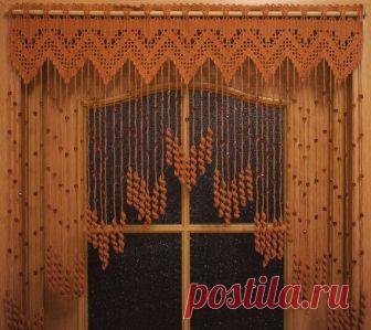Вязаные шторы на дверной проем, коричневые с акриловыми бусинами