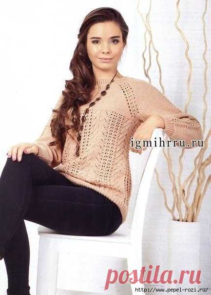 Ажурный пуловер с кокеткой Времена строгости миновали, настала пора свободных струящихся силуэтов. К этому прилагается: элитная пряжа из вискозы и шелка, таинственный оттенок графита и воздушный ажур.Размеры: 34/36 (40/42) 46/48Вам потребуется: пряжа (90% вискозы, 10% шелка; 140 м/50 г) – 400 (400) 450 г серой; спицы № 3 и