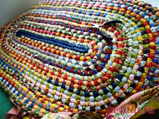 Плед из старых трикотажных вещей - Эфария Вот такой красивый плед можно сделать и подарить старым вещам вторую жизнь. У меня столько много старых свитеров, которые уже не носим и выкинуть жалко. Часть поста, которую вы хотите скрыть Нам потребуется: трикотажные вещи (свитера или юбки). Белая объемная пряжа, 1 моток, длина нити 200—250 м. Описание работы: 1) Выкройте из свитеров разного цвета