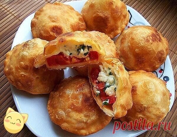 Вкусняшки. Пирожки с необычной начинкой: брынза или творог, помидоры, зелень и чеснок.