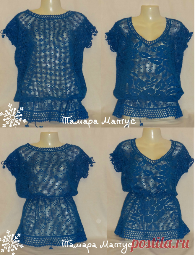 Туника "Синие мои цветы..." выполнена крючком из мерсеризованного хлопка в технике филейного кружева. .Длина туники 70см. Длина рукава 10см. К тунике прилагается поясок.