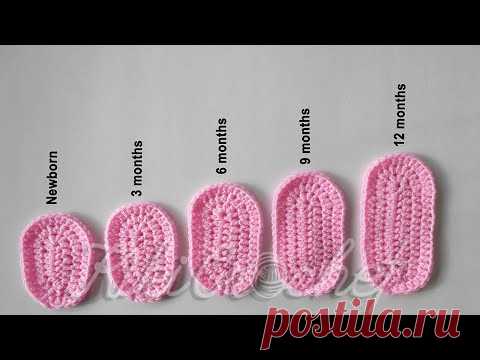 Связанная крючком подошва для детских тапочек - 5 размеров (0-12 месяцев) + таблица