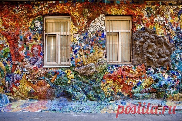 Мозаичный дворик Мозаичный дворик - одна из молодых достопримечательностей Санкт-Петербурга. Скамейки и дорожки, цокольные этажи и скульптуры, детская площадка и солнечные часы во дворе по адресу ул. Чайковского, д.2 украшены красочными панно и рисунками из мозаики.