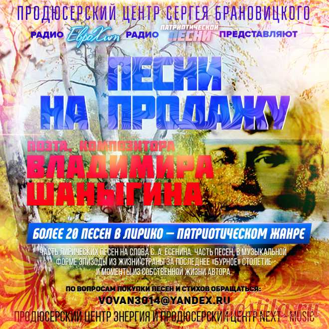 Песни на Продажу — более 20 песен в лирико — патриотическом жанре от поэта — песенника Владимира ШАНЫГИНА.