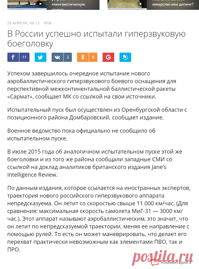 В России успешно испытали гиперзвуковую боеголовку — Rambler News Service