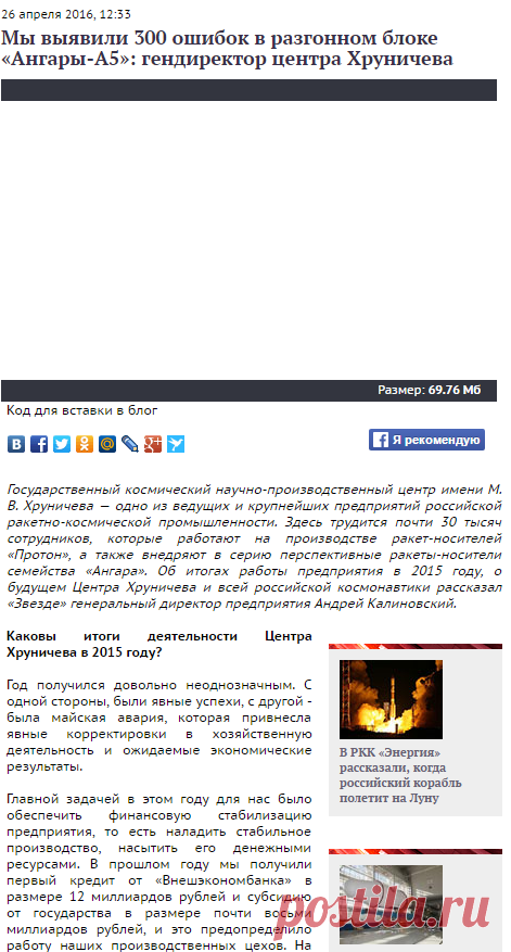 Мы выявили 300 ошибок в разгонном блоке «Ангары-А5»: гендиректор центра Хруничева - Телеканал «Звезда»