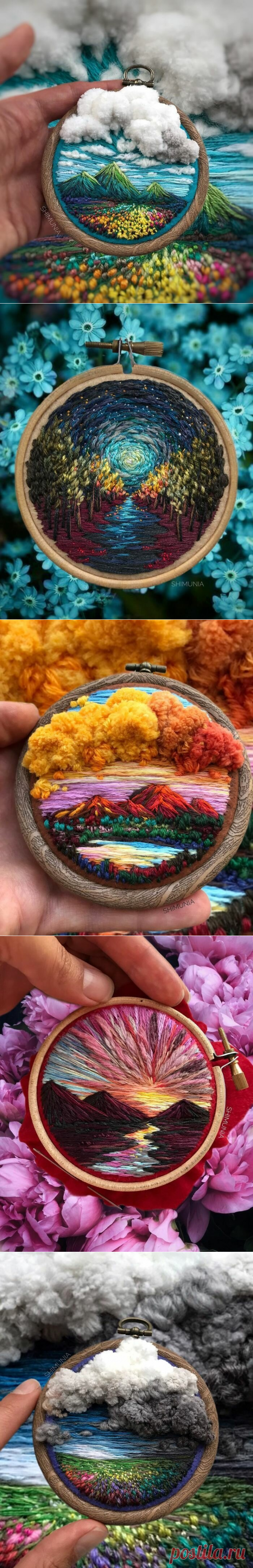 Пейзажи с помощью ниток от Веры Шимуни Художники по вышивке некоторое время назад стали весьма творчески подходить к этому виду рукоделия, в чём мы не раз убеждались. В то время как одни являются приверженцами традиционной вышивки, создавая простые узоры, другие используют нить вместо кисти, вышивая выразительные текстуры и живописно сочетая цвета.