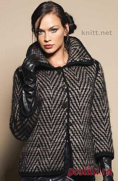 Вязаное пальто с геометрическим узором. Классическая модель кроя, геометрический рисунок, застежки — пуговицы — актуальная модель для весеннего и осеннего времени года. Объемный воротник смотрится потрясающе, а рукава 3/4 позволят носить удлиненные перчатки.