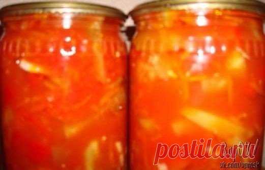 1 кг моркови и 1 кг сладкого перца нарезать, добавить 400 г вымытого риса, 1 стакан сахара, соль по вкусу и 400 г растительного масла. Соединить с томатной массой, довести до кипения на умеренном огне, затем тушить 1 час на медленном огне. Разложить горячую закуску в подготовленные банки и закатать. Хранить в холодном месте.