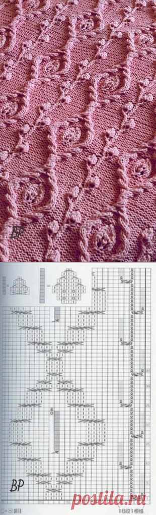 Так же в узоре используется лицевая скрещенная петля, которая чередуется с изнаночной. Такое сочетание создает красивую веерообразную половинку ромбика.