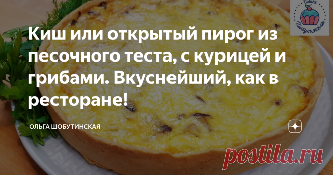 Киш или открытый пирог из песочного теста, с курицей и грибами. Вкуснейший, как в ресторане! Киш - это открытый пирог из песочного теста, на которое выкладывается начинка и заливается сливочная заливка! В этом рецепте киш с курицей и грибами! С начинкой можно фантазировать. Пирог вкуснейший, как в ресторане;) Песочное тесто: Муку смешиваю с солью и разрыхлителем. Добавляю холодное масло, нарезанное кубиками. Перетираю в мелкую крошку. Добавляю желток и 2...3 ст.л. воды. ...