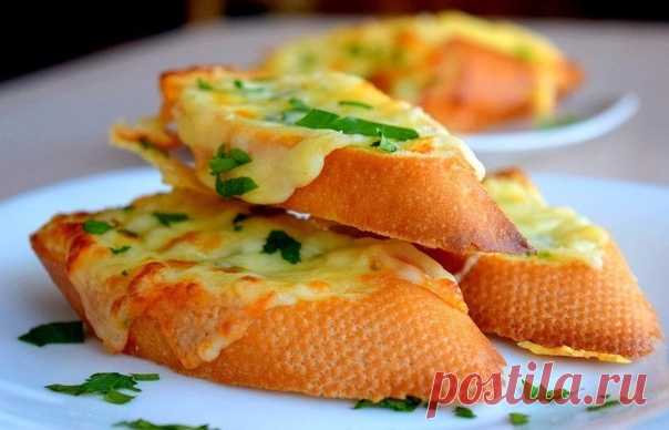 Хрустящие кусочки багета смазанные ароматным сливочным маслом (с чесноком и петрушкой), посыпанные сыром и запеченные в духовке.