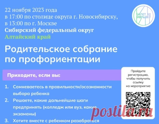 Всероссийское родительское собрание по профориентации "Билет в будущее" Всероссийское собрание от проекта "Билет в будущее" приглашает родителей, которым неравнодушен профессиональный выбор детей.