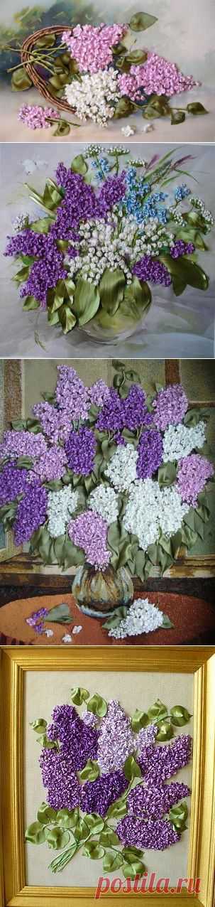 Цветочки сирени. Вышивка лентами. Мастер класс