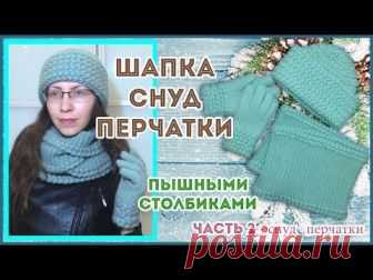 Шапка с отворотом, снуд в два оборота и перчатки пышными столбиками крючком - часть 2