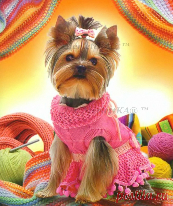 Вязаная одежда для собак своими руками: вяжем платье для собаки Предлагаю связать вашей маленькой собачке такую одежду, как платье. Это платье для собаки небольшого размера, оно вяжется спицами по такому же принципу, как и такая вязаная одежда для собак своими руками, как свитер с рукавчиками.