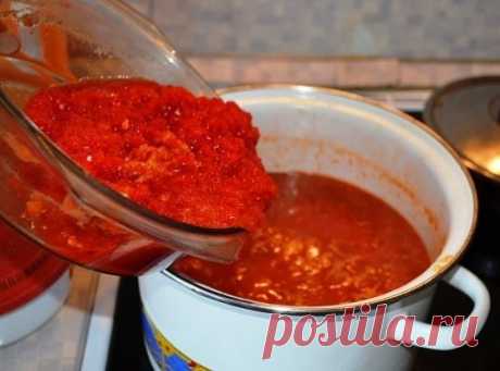 Наливаем в посудину масло, доводим до кипения, добавляем помидоры, прокрученные на мясорубке и варим 1 час. Потом добавляем болгарский перец и чеснок, тоже прокрученные на мясорубке и варить ещё 15 мин. Кто любит поострее - жгучий перец добавляйте вместе с болгарским, кто не любит острого - с пом
