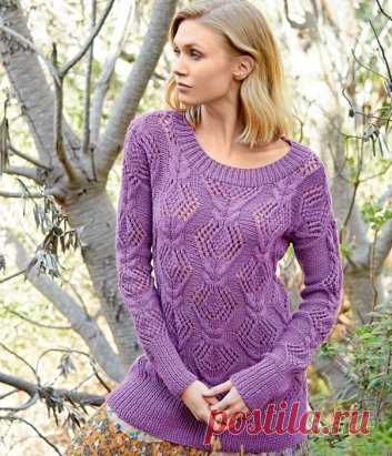 Красивый рельефный узор этого свитера привлекает внимание, а практичная пряжа из шерсти и хлопка делает модель очень приятной в носке.