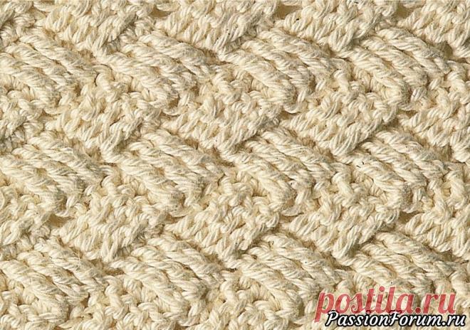 1 ряд: 2п пропустите, 2 лицевых рельефных столбика (далее лиц рел ст) с 2 накидами (далее 2н), 2 лиц рел ст с 2н позади 1-й группы п за пропущ. п.; 2п пропустите, 2 лиц рел ст с 2н, 2 лиц рел ст с 2н перед 1-й группы п за пропущ. п.; 4 лиц рел ст с 1н; 2п пропустите, 2 лиц рел ст с 2н, 2 лиц рел ст с 2н позади 1-й группы п за пропущ. п.; 2п пропустите, 2 лиц рел ст с 2н, 2 лиц рел ст с 2н перед 1-й группы п за пропущ. п.