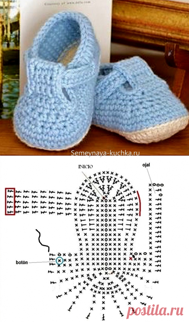 Подошва. Набираем 16 воздушных петель. В четвертую петлю от крючка провязываем 3 ст. с накидом. Далее вяжем по схеме 1. В 4-м ряду вас должно получиться 70 ст. б.н. (рис 1)