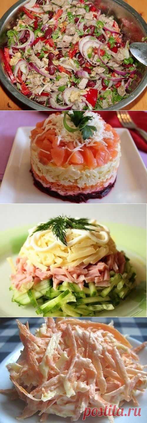1. Ветчина, яйцо, сл.перец, огурец, кон.кукуруза...2. "Тбилиси": крас.фасоль, говядина, кр.лук, кр.болг.перец... 3. Фасоль крас., яйцо, краб. палочки...4."Сёмга на шубе": филе малосол.сёмги, лук, яйцо...5. «Мужская мечта» - ветчина, сыр, перец сладкий, огурец, яйцо...6. Слабосол.семга, огурец, яйцо...7. Морковь, сыр, чеснок....8. "Максим": курин.окорочка, консер.шампины, сол.огурцы...9. "Бонопарт": свеж.шампиньоны, курин.филе...10.
