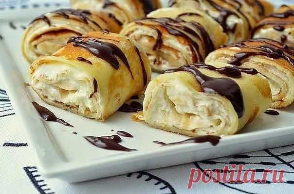 Роллы из рисовых блинчиков с творожно-банановым кремом и шоколадным соусом